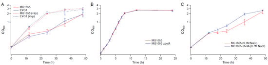 Several genes upregulated in strain EJW3 under osmotic stress were chosen for further validation for their role in osmotic tolerance in the rpoC K370_A396dup background. The selected genes (Table S9) are involved in amino acids metabolism and were chosen based on results from the amino acid supplementation and metabolite analysis. These genes were overexpressed in BW25113 by using clones from the ASKA collection [35], and the growth kinetics of the overexpression strains were compared against the control expressing the empty plasmid in M9 with or without NaCl supplementation. To avoid potential toxicity associated with high level gene expression, basal level expression (without Isopropyl β-D-1-thiogalactopyranoside (IPTG) induction) and a lower osmotic stress (0.55 M NaCl) were used. Among the genes tested, only the overexpression of metK and mmuP significantly improved the performance of BW25113 under osmotic stress. The overexpression of metK and mmuP did not impact the growth of BW25113 in the absence of hyperosmotic stress, but rather conferred a benefit in the presence of 0.55 M NaCl (Figure 8). This suggests that the osmotic tolerance conferred by the rpoC mutation in BW25113 is partially due to the upregulation of metK and mmuP. MetK encodes the methionine adenosyltransferase that catalyzes the formation of the S-adenosylmethionine (AdoMet) [64], which is involved in many biological reactions. It plays important roles as donors of methyl, sulfur, and aminopropyl groups, thus is frequently involved in the regulation of gene expression, including genes involved in methionine metabolism [65,66,67,68], but was not known to be related to osmotolerance. MmuP is a transporter of S-methylmethionine, which can be used by E. coli as a source of methionine when externally provided [69]. S-methylmethionine is widely produced by plants and can be used as an osmoprotectants in plants [70], but it has not been reported as an osmoprotecant in E. coli. As E. coli is not known to produce S-methylmethionine, nor did we supplement S-methylmethionine into the media, in this case, the impact of mmuP on osmotic tolerance is not obvious. Stress response genes bolA and hdeA are downregulated in the BW25113 rpoC mutant, and the deletion of bolA and hdeA improved the growth of BW25113 in the presence of 0.6 M NaCl (Figure 9). BolA is a transcriptional regulator involved in regulating cell morphology related genes, and is known to be involved in general stress response and has been reported to be overexpressed under osmotic stress [71]; however, the mechanism of how it is involved in osmotic tolerance remains unclear. HdeA is a periplasmic acid stress chaperone which plays a role in resistance to low pH [72,73], and it is not known to be related to osmotic tolerance.