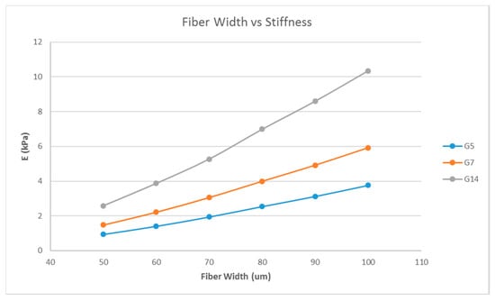 Effect of varying fiber widths on the stiffness of the structure consisting of a single layer with 16 unit cells with a fixed unit cell pore side length (p = 200 μm) for G5, G7, and G14.