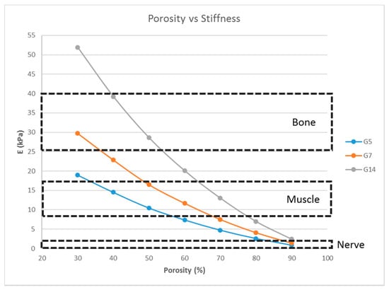 From the previous sections, with G5, G7, and G14 as the scaffold materials, scaffold designs with the stiffness range for myogenic and osteogenic lineages were obtained easily, while there are only limited scaffold designs with the stiffness range for the neurogenic lineage. The scaffold designs corresponding to the stiffness range suitable for the neurogenic lineage, as determined in the previous sections, were single-layer scaffolds with high porosity, which is practically difficult to fabricate and handle. This limitation could be overcome by choosing a different material. This section studies two other materials, namely PCL and chitosan, and its effects on the scaffold stiffness (Figure 7 and Figure 8).