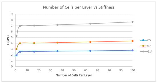Effect of the number of unit cells per layer on the stiffness of the structure with a fixed fiber width (d = 80 μm), porosity (=80%), and unit cell pore side length (p = 200 μm) for G5, G7, and G14.