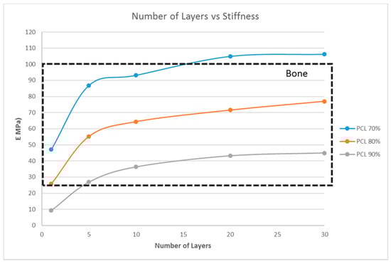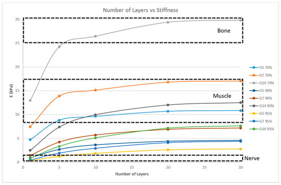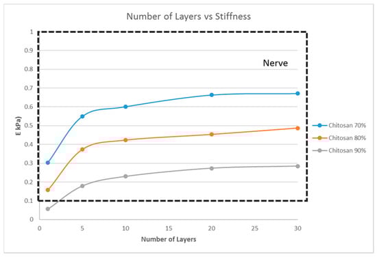 However, the thickness of the scaffold, as a measure of the number of layers, influences the matrix stiffness, as seen in Figure 6. For G14 material, a single layer scaffold of 16 unit cells with 70% porosity yields a stiffness range for the myogenic lineage, while multi-layer scaffolds of 10 layers and above with 16 unit cells in each layer with the same porosity of 70% has the stiffness range suitable for the osteogenic lineage. However, it is important to note that thicker scaffolds (>500 μm) might result in hypoxic gradients and, hence, affect the differentiating cell metabolism []. Though the effects of hypoxic gradients are less pronounced in macroporous scaffolds, this study also helps in determining the minimum number of layers for a particular material-pore size-porosity combination so that the thickness can be kept below 500 μm without compromising the matrix stiffness. For instance, in Figure 6, G14 70%, a scaffold with one layer, has a stiffness in the neurogenic range while 10 layers and above are in the osteogenic range. Hence, 10 layers will ensure that the stiffness is in the osteogenic range and there is no need to go up to 30 layers, avoiding much thicker scaffolds and hypoxic gradients. Lastly, the effect of material selection is also studied. If chitosan is used as the material for scaffold fabrication, irrespective of the number of layers and porosity, the stiffness range always lies within the neurogenic lineage (<1 kPa) as shown in Figure 7. Similarly, if the material considered is PCL, then the range of stiffness obtained is always in the osteogenic lineage range, irrespective of the number of layers or the porosity.