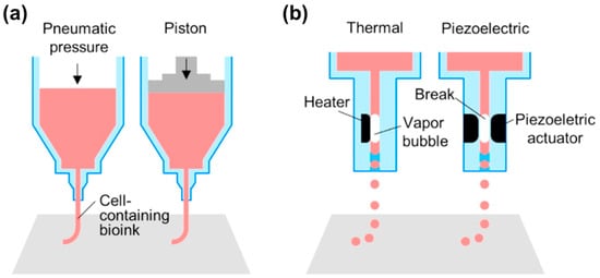 Ink-jet printing has a high-resolution characteristic because it can generate very small droplets (1–100 picolitres) by using a mechanical pulse of the printing head (Figure 1b) [66]. This system requires lower viscose bioink (3.5–12 mPa·s) than other techniques. Thermal and piezo-electric methods are commonly used to shoot the bioink from the head, and the motion stage facilitate to generate specific 2D patterns or 3D structures. In particular, a thermal inkjet printer makes drops of bioinks by a heating pulse from the micro-heater [67]. A piezoelectric inkjet printer, the direct mechanical pulse is generated by a piezoelectric actuator and causes a force to expel bioink droplets from the printing head [68]. The diameter of the droplet usually depends on the size of nozzles, and the currently used diameter is equal to or larger than 30 μm [69].