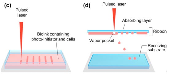 The LIFT method produces a cell-containing droplet by pulsing onto a cell-containing bioink layer (called ribbon), which is placed below a laser energy-absorbing layer (Figure 1d) [71,72]. This “aim-and-shoot” procedure induces localized evaporation of the absorbing layer, and the generated gas pressure pushes the bioink droplet off the ribbon toward the hydrogel-coated collector slide. This nozzle-free system often uses highly viscous bioinks (1–300 mPa·s) to create a robust 3D structure composed of a sophisticated pattern of cells, and it offers the highest resolution to control the droplets.