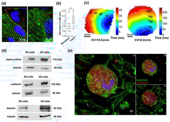 3D models for cardiovascular tissue modeling: (a) Representative immunostainings of hESC-CMs in a two-week-old tissue patch coupled by connexin-43 gap junctions (left) and in two-week-old monolayers (right); (b) Median and quartile sarcomere lengths in monolayers (n = 58 hESC-CMs) and patches (n = 106 hESC-CMs). * p < 0.0001; (c) Representative isochrone maps during 1 Hz point stimulation of a two-week old cardiac patch (left) and monolayer (right); (d) Higher expression of desmin, alpha-actinin and cadherin in 3D-aggregates compared to in 2D-cells; (e) Comparison of the distribution of microtubules in 2D- and 3D-cardiac cultures. Reproduction with permission from [74,75].