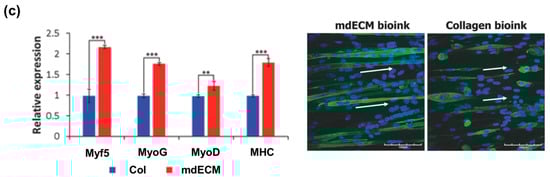 Tissue-specific decellularized ECM (dECM) is capable of promoting cellular functions by providing a favorable constructive remodeling properties of native tissues [86]. It can recapitulate the native microenvironment of native tissues, including composition, structure, and biomechanical properties, which are critical regulators of cell fates (e.g., survival, maturation, differentiation, and migration). The polymerization mechanism of the dECM bioink is a temperature-responsible crosslinking under a physiological condition. This is a valuable feature of collagenous proteins in the dECM bioink for bioprinting purposes. Recently, a variety of tissue-derived dECMs (e.g., adipose, cartilage, cardiac muscle, skeletal muscle, and liver) have been formulated and applied as bioinks. In support of this concept, Pati et al. showed that dECM bioink induced the higher mRNA expression of cardiac-specific genes (Myh6 and Actn1) and the higher expression of the cardiac β-myosin heavy chain gene after 14 days in culture as compared with a collagen-based construct (Figure 3a,b) [87]. In addition, Choi et al. demonstrated the significantly higher expression of myogenic genes (Myf5, MyoG, MyoD, and MHC) and increased myotube formation compared with a collagen-based construct (Figure 3c) [88]. In this regard, the combination of dECM bioink with the 3D cell printing technique offers the possibility to modulate cell alignment, control graft structure, and place the inner vascular structures, which help engineered tissues achieve promoted cell activities, improve tissue functions, and accelerate therapeutic effects.