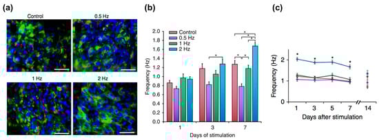 Electrical stimulation for the maturation of the engineered tissues: (a) Immunostaining results of troponin (green) counterstained with 4,6-diamidino-2-phenylindole (DAPI, blue). Scale bar, 50 μm; n ≥ 3; (b) Electrical stimulation for the regulation of automaticity in human stem cell-derived cardiomyocytes; (c) Frequency of autonomously beating cardiomyocytes as a function of duration of stimulation (average ± s.e.m., n = 30, * p < 0.05). Reproduction with permission from [22].