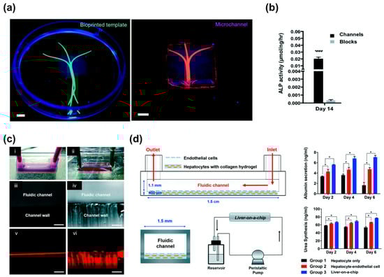 3D printed microfluidic models: (a) Photographs of the bioprinted templates (green) enclosed in GelMA hydrogels and the respective microchannels perfused with a fluorescent microbead suspension (pink); (b) Significantly higher ALP activity levels in cell-laden constructs with microchannels versus cell-laden hydrogel blocks on Day 14 (**** p < 0.0001). (Scale bar, 700 μm); (c) Channels made by the: (i) PCL material; and (ii) PDMS material; (d) Schematic illustration of the side view, vertical section view, and perfusion system of the liver-on-a-chip. Liver function analysis with albumin and urea tests (* p < 0.05). Reproduction with permission from [113,114].