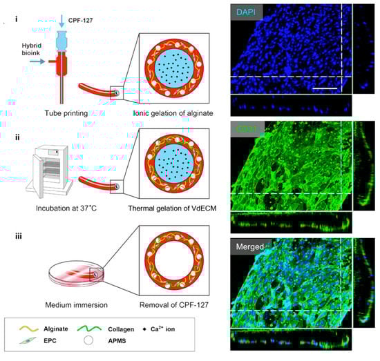 By applying the particularly designed nozzles such as multi-axial nozzles, a tube-like structure can be created directly after the fabrication process. Zhang et al. fabricated a vessel-like microfluidic channel using a co-axial nozzle system that enabled the direct printing of a hollow vascular channel in a 3D hydrogel [126]. Gao et al. also developed a tube-like structure using a co-axial bioprinting technique [127]. Interestingly, they used a hybrid bioink composed of dECM derived from aortic tissue and sodium alginate hydrogel and mixed with endothelial progenitor cells, and this hybrid bioink was supplemented with microcapsules of the atorvastatin drug (Figure 7). The results showed striking performance in promoting survival and vascularization potential both in vitro and in vivo. In addition, the engineered blood vessel maintained patency and formed a fully differentiated endothelial layer after culture for seven days in vitro.