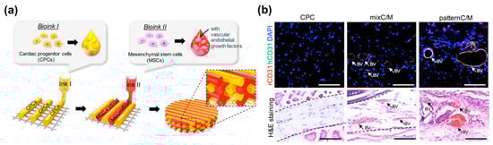 This strategy is the printing of vascular cells directly in the engineered tissues [38,118,126,128]. ECM remodeling allows vascular tissue assembly, leading to the fusion and maturation of scaffold-free tissues around the endothelial cells as well as the tight fusion of the tissues to the engineered vasculature [129]. This macrovasculature creation is also expected to form the surrounding capillaries by the natural vascular remodeling process. In addition, the direct printing of vascular networks possesses a high scalability that facilitates the programmable arrangement of cellular components with a desired architecture. Jang et al. demonstrated that the multicellular patterning of cardiac patches promotes the survival of delivered stem cells (Figure 8a,b) [38]. The patterned vascular cells (human turbinate tissue-derived mesenchymal stem cells supplemented with VEGF) promoted rapid host-graft anastomosis and tissue formation. It also ameliorated cardiac function and cellular infiltration into the infarct area as well as reduced cardiac hypertrophy and fibrosis. Ma et al. fabricated a 3D hexagonal liver lobule tissue composed of hepatocytes and supporting cells [115]. They used a digital micro-mirror device (DMD) system that uses LED light (365 nm) for the polymerization of light-active bioink. Human-induced pluripotent stem cell-derived hepatic progenitor cells (hiPSCs-HPCs) were encapsulated in GelMA bioink and printed with a hexagonal shape. The supporting cells (i.e., HUVECs and human ASCs) were embedded in the mixture of glycidyl methacrylated-hyaluronic acid (GMHA) and placed in between HPC-laden hexagonal shapes to promote vascularization. As a result, this engineered tissue improved the expression of liver-specific marker genes as well as the secretion of metabolic products (e.g., urea and albumin) while maintaining the printed cellular pattern of the liver lobule.