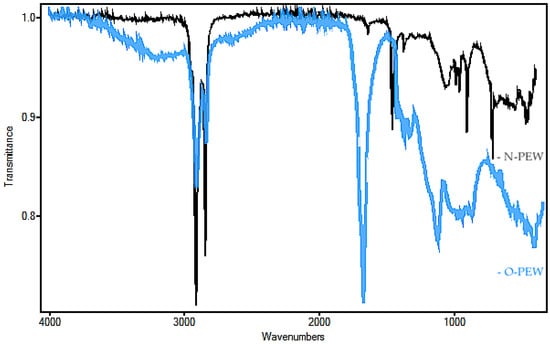 The non-oxidized wax obtained for this study was tested to confirm its structure and chemical properties. The waxes were produced from waste plastic underwent thermal cracking to produce a refined gas that was then condensed into a wax []. FTIR was performed on O-PEW and N-PEW for comparison and to determine the presence or absence of functional groups associated with oxidation (Figure 1).