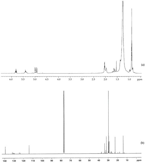 The structure of the non-oxidized PE wax was further studied using 1H-NMR and 13C-NMR, as shown in Figure 2a,b. In the 1H-NMR, there are strong signals at 0.88 and 1.25 ppm, which are attributed to CH3 and CH2. The signals at 1.6 and 2.0 ppm may be due to the allylic hydrogen or hydrogen adjacent to the C=O group. There are signals at 4.9 ppm, 5.4 ppm, and 5.8 ppm in the 1H spectrum, and there are signals at 114 ppm and 139 ppm in the 13C spectrum.