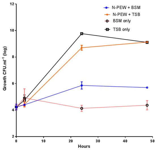 The growth of C. necator H16 in TSB only (control), BSM only, and TSB/BSM supplemented with N-PEW is shown in Figure 3.
