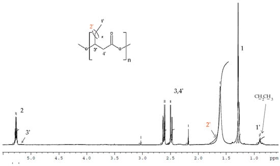 1H-NMR was used to determine the structure of the copolymers produced. It was found that PHB was produced in the TSB only fermentation (data not shown) []. In the spectrum (Figure 4) the signals corresponded to the protons of the HB repeating units (labelled 1, 2, and 3) and additional signals at δ = 0.9 (-CH2CH3) and δ = 5.17 (-CH) correspond to HV repeated units that were observed. These signals are typical for PHAs with longer aliphatic groups in the β-position [,]. After integrating these signals, the content of monomer units other than 3-hydroxybutyrate (3-HB) has been estimated at 11 mol% 3-hydroxyvalerate (HV). However, due to some overlapping of certain signals, the protons of 2′ were not visible, although they have been reported in that location in PHBV previously [].