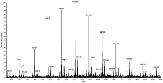 The controlled thermal degradation of PHAs synthesized from N-PEW, induced by KHCO3, was performed according to the procedure referred to in Section 2.6.4 []. This kind of E1cB degradation leads to PHA oligomers with unsaturated and carboxylic end groups. The results of PHAs formed from TSB with N-PEW are displayed in Figure 5, Figure 6 and Figure 7. Scheme 1 shows the general structure of the ions presented in the ESI-MS spectra.