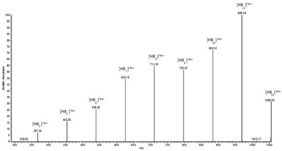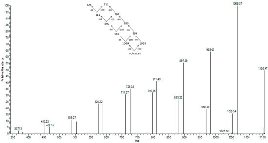 In Figure 7 the fragmentation of the sodium adduct ion of oligomer of [HB13HV + Na]+ at m/z at 1155 m/z is presented. This parent ion produces fragment ions of subsequent oligomers according to the theoretical fragmentation pathway diagram. The loss of 86 Da equates to the loss of crotonic acid (e.g., 1155–1069 m/z), and the loss of 100 Da equates to an HV unit. The fragmentation spectrum of these ions confirms that the most intensive ions in the clusters correspond to sodium adducts of 3-hydroxybutyrate oligomers. Therefore, the fragmentation spectrum for the precursor ion at m/z 1155 confirms the presence of 3-hydroxybutyrate and randomly-distributed 3-hydroxyvalerate co-monomer units in polyester chains produced from N-PEW and TSB.