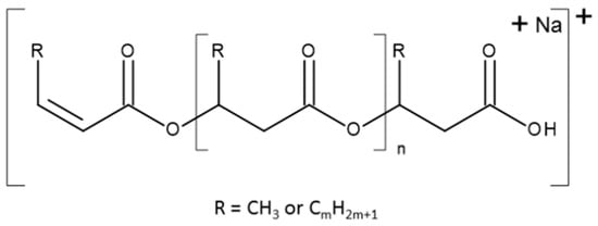 There are two series of ions visible in the mass spectrum. The main series of the ions at m/z 1571, 1485, 1399, 1313, 1277, 1141, 1055, 969, 883, and 797 corresponds to the sodium adduct of oligomers with crotonate and carboxyl end groups, calculated according to the formula m/z 86 + (86 × n) + 23, as shown in Scheme 1. There are also a small series of ions besides the main series. The m/z difference is 14 between the main series and the small series, which corresponds to a CH2 group.