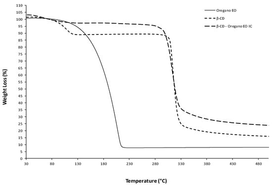 Thermogravimetric (TG) analyses were also conducted in the final dried β-CD–oregano EO ICs, β-CD and oregano EO. The TG analyses were performed in the TGA/DSC 1 STARe System Thermobalance (Mettler Toledo, Columbus, OH, USA), with the samples being heated from 25 °C to 600 °C, at a heating rate of 10 °C/min under nitrogen gas flow (10 mL/min).
