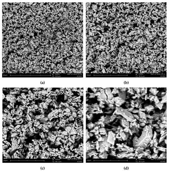 Evidence concerning the morphological characteristics of the formed β-CD—oregano EO ICs was obtained using SEM. Figure 4 presents the SEM images of the ICs at (a) ×2000, (b) ×2500, (c) ×5000 and (d) ×10,000 magnification.