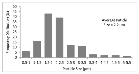 As can be observed, the β-CD–oregano EO ICs present a non-spherical morphology which resembles that of prisms, having parallel and rather smooth sides. Moreover, the images reveal that the β-CD – oregano EO ICs form agglomerates of different sizes, with the larger particles possibly attracting the smaller ones, while a size analysis of the particles through the obtained SEM images revealed an average particle size of 2.2 μm (Figure 5). Similar observations have been previously reported by Ikuta et al. [], Dima et al. [] and Rakmai et al. [].