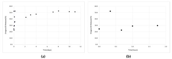 The release profile of the encapsulated oregano EO at 37 °C and pH 7.4, during 11 days (a), as well as at the first 1 h and 45 min of the experiment (b).