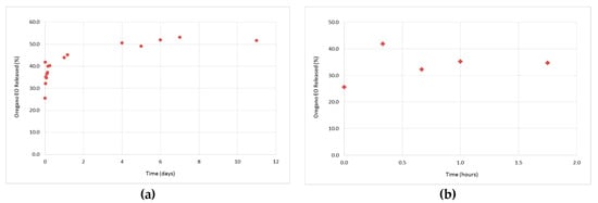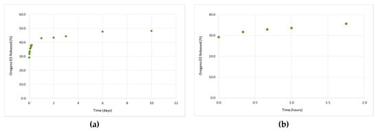 As far as the release profiles at 50 °C and pH 7.4 (Figure 7a), as well as at 37 °C and pH 5.5 (Figure 8a), are concerned, a similar pattern to that described above (37 °C, pH 7.4) is followed. In particular, at 50 °C and pH 7.4, a cumulative amount of 51.7% of oregano EO was released after 11 days, out of which 34.7% was released during the “burst effect” (0 h–1 h and 45 min) (Figure 7b) and 17% during the “lag time” (after 1 h and 45 min). On the other hand, at 37 °C and pH 5.5, 35.5% of the oregano EO was released within 1 h and 45 min at a fast rate (Figure 8b), while the rest 12.6% was constantly released at a slower rate for the next 10 days, after which no more oregano EO was released.