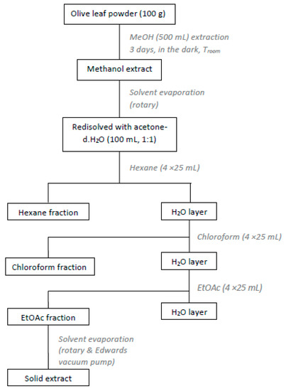 The dried olive leaves were extracted with organic solvents of different polarity [15]. Briefly, dried leaves (100 g) were chopped and extracted with methanol (500 mL) for 3 days, in the dark, at room temperature. Afterwards the methanol extract was filtered and concentrated under reduced pressure. The residue was re-dissolved in an acetone-water solution (100 mL, 1:1) and washed with hexane (4 × 25 mL), chloroform (4 × 25 mL) and ethyl acetate (4 × 25 mL). The ethyl acetate extracts were combined and concentrated in vacuo (Figure 1). The solid residue (2.2 g) was collected and kept at 4 °C, in dark-coloured glass vials. The procedure was repeated for the rest of the dried material. Finally, from the 670.4 g of dried olive leaves a total amount of 14.8 g of extract was obtained (yield 2.2%).