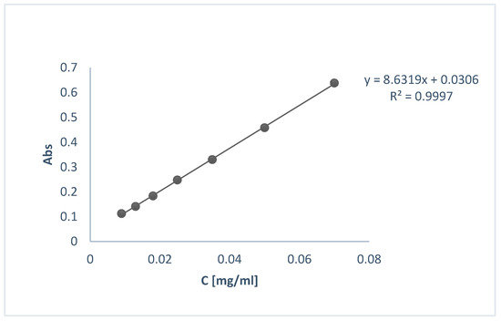Encapsulation efficiency (EE%) was determined indirectly using UV-Vis spectroscopy. For that purpose, the supernatants (S1, S2) from the centrifugation step of the preparation of loaded NPs were decanted and their UV-Vis spectrum was obtained at 287 nm. The concentration of OLE was calculated using the calibration curve shown in Figure 2.