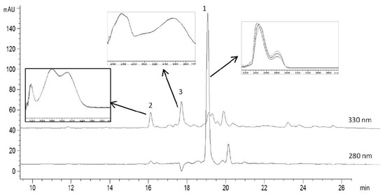 HPLC chromatogram of olive leaves extract (OLE). The peaks that were identified are: 1 oleuropein, 2 vanillin and 3 rutin. The UV-VIS spectra corresponding to the main polyphenols components are shown above the chromatogram.