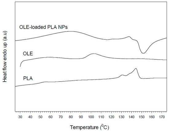 Differential scanning calorimetry (DSC) thermograms of pure poly(lactic acid) (PLA), olive leaves extract (OLE), and PLA nanoparticles loaded with oil leaves extract (OLE-loaded NPs).