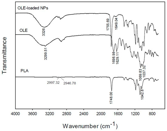 FT-IR (ATR) spectra of pure poly(lactic acid) (PLA), olive leaves extract (OLE), and PLA nanoparticles loaded with olive leaves extract (OLE-loaded NPs).