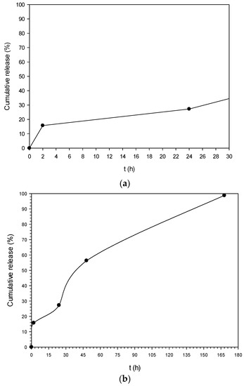 Preliminary in vitro release experiments were conducted in pH 5.6 at 37 ± 0.5 °C. This pH value was selected as it is the pH of healthy skin [46]. The release profile is depicted in Figure 7a,b. At t = 2 h a burst effect was observed in which a cumulative amount of 15.7% of OLE was released (Figure 7a). After that, it is obvious that OLE “escaped” at a constant rate from the NPs reaching almost 100% cumulative release after 168 h (7 days) (Figure 7b).