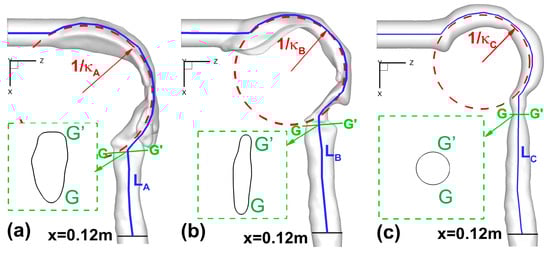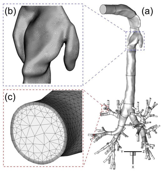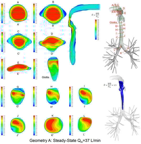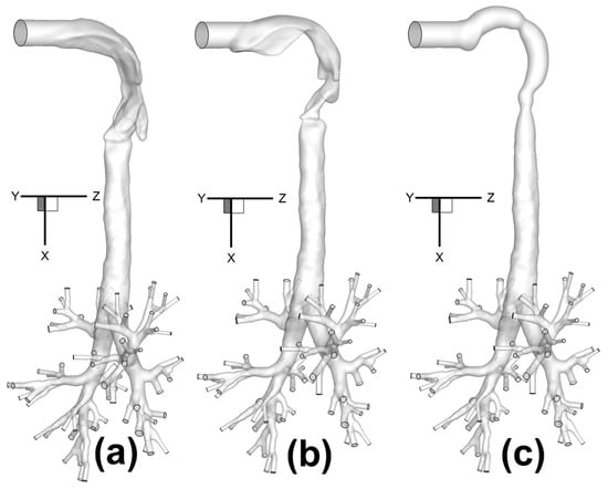Table 1 lists geometric parameters at different cross-sections in the three upper airways (see Figure 2a–c). Locations of different cross-sections are also shown in Section 3.2.