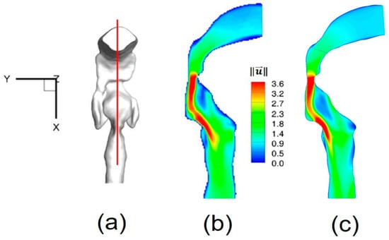 Nondimensionalized velocity magnitude contour comparison at sagittal plane: (a) Sagittal plane location; (b) Experimental measurement (Reprinted from Reference [], with permission from Springer); (c) Numerical simulation.