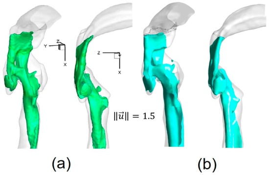 To better visualize the laryngeal core structures for , Figure 9a–c show the iso-surfaces in three geometries for two steady-state inhalation flow rates, i.e., Qin = 37 L/min and Qin = 75 L/min. Specifically, Uin is the average inlet velocity at the mouth.