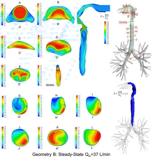 - Due to the large constriction ratio and low circularity at the glottis in Geometry B, high flow resistance around the glottis region breaks up the jet core and spreads it towards the wall (see the contour in the sagittal plane in Figure 7). Recirculation is generated at the upper trachea. However, no such flow patterns are observed in Geometries A and C.