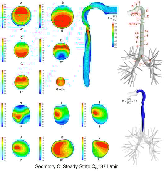 Indeed, Figure 6, Figure 7, Figure 8, Figure 9 and Figure 10 indicate that laryngeal jet cores deviate from the trachea centerlines with highly distinguished patterns in all three geometries for different inhalation flow rates. For example, the jet core impacts the front right trachea in Geometry C, the front left trachea in Geometry B, and the back left trachea in Geometry A, respectively. No common characteristics were discovered, due to the highly different geometric characteristics among the three geometries. Furthermore, Figure 10 indicates that the constriction ratio has an impact on the length of the jet core. Specifically, a small constriction ratio generates a stronger jet core with a longer core length (Geometry C vs. Geometry A).