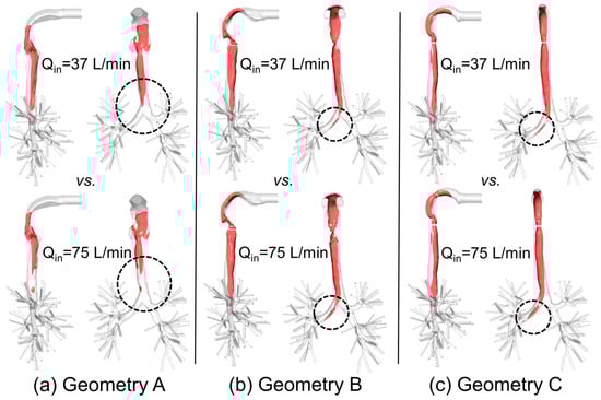 Iso-surfaces of the laryngeal cores in three geometries under two steady-state inhalation flow rates (Qin = 37 L/min vs. Qin = 75 L/min): (a) Geometry A; (b) Geometry B; (c) Geometry C.