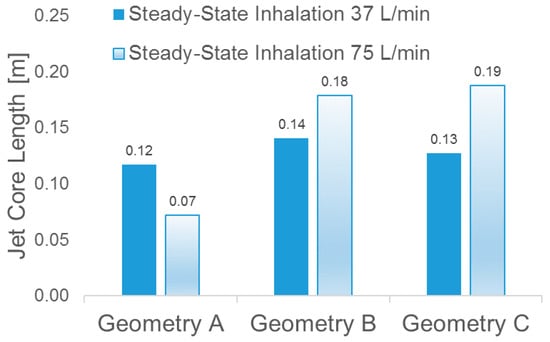 Laryngeal jet core lengths of in the three geometries under two steady-state inhalation flow rates.