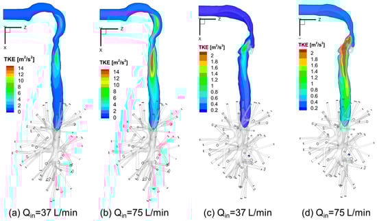 Turbulence Kinetic Energy (TKE) distributions at sagittal planes under different inhalation flow rates: (a) Qin = 37 L/min for Geometry C; (b) Qin = 75 L/min for Geometry C; (c) Qin = 37 L/min for Geometry A; (d) Qin = 75 L/min for Geometry A.