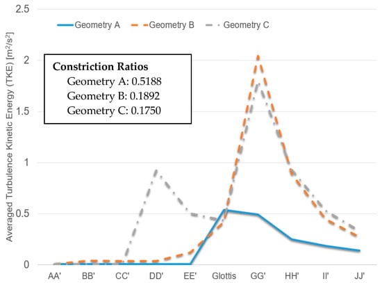 Additionally, Figure 12 shows the averaged TKE of cross-sections AA′ to JJ′ (see Figure 6, Figure 7 and Figure 8 for cross-section locations). The averaged TKE abruptly increases after the constriction of the glottis. It can be observed that the constriction ratio has a significant impact on the higher TKE in the trachea. Indeed, Geometries B and C have similar trends of TKE after the airflows pass the glottis contractions (see Figure 12). In contrast, with a higher constriction ratio, the increase of TKE in Geometry A after the glottis is less steep than that in the other two. The comparison between Geometries B and C also implies that the glottis contraction serves as a transitional flow regulator due to the forced mixing effect when airflow passes the contraction region. Although the averaged TKE at cross-sections differs in the two geometries, their downstream-glottis trends are similar. However, more geometries need to be included in the inter-subject variability study to test this “glottis regulator” concept.