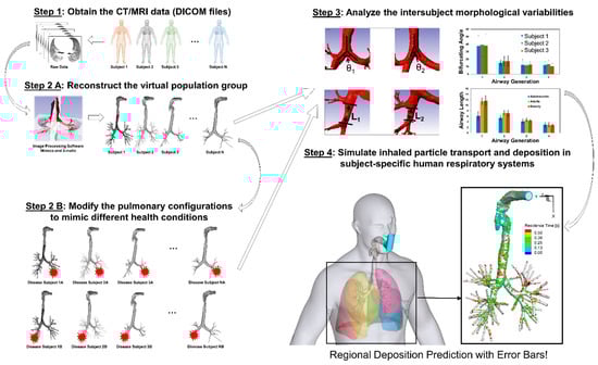 Considering the complexity of multiple geometric parameters, it is necessary to include additional airway geometries representing different population groups to generate statistically robust conclusions, i.e., CFPD simulation results with “error bars.” The proposed framework of in silico subject variability study is shown in Figure 13, to pave the way for the development of a virtual human system as the individualized digital twin for personalized pulmonary disease treatment planning.