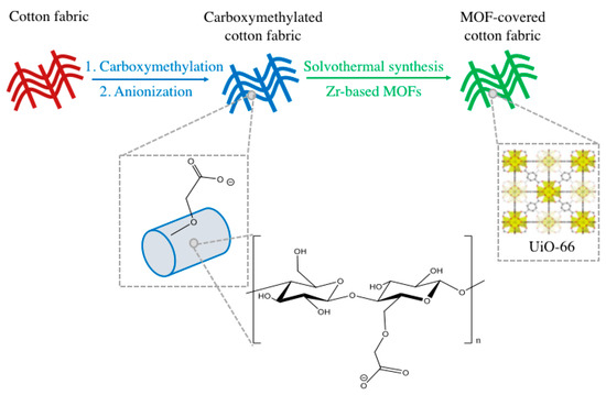 Herein, we report on the growth of UiO-66 on cotton, using methods amenable to existing manufacturing processes used in the textile industry. Figure 1 shows the two-step synthesis pathway followed: The first step is the carboxymethylation of the cotton substrates [21], and the second step is the low-temperature solvothermal synthesis of the MOF on the surface of the carboxymethylated fibers.