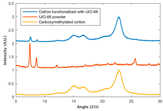 XRD spectra of cotton samples functionalized with UiO-66 confirmed the crystalline formation of the MOF on the cotton fabric, as shown in Figure 2. Figure 2 also shows that the XRD pattern of the carboxymethylated cotton sample (yellow) exhibited only the characteristic peaks for cellulose (15°, 16° and 23°) [38]. The UiO-66 powder sample (red) matched the peaks reported in the literature [17]. The cotton sample functionalized with UiO-66 (blue) exhibited both the peaks assigned to cellulose and those assigned to UiO-66 in clear superposition, confirming the presence of the crystalline MOF onto the fabric.