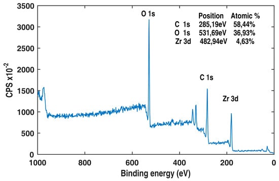 XPS (Figure 3) confirmed that the crystalline formation was composed of zirconium, carbon and oxygen. Because of the fact that the substrate, cellulose, was also composed of carbon and oxygen, a quantitative analysis of the MOF content was not possible. The XPS spectra also showed no chlorine, confirming that the zirconium was stoichiometrically coordinated to the oxygen. Moreover, because of the absence of nitrogen in the spectrum, we also concluded that the solvent, DMF, was completely removed from the pores of the UIO-66 framework.