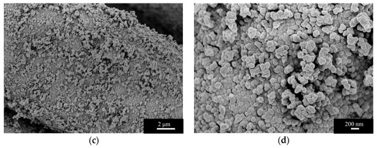SEM imaging confirmed the uniformity of the UiO-66 functionalization on the surface of the cotton fabrics, as shown in Figure 4b,c. An SEM image of pristine cotton fibers is shown in Figure 4a for reference [38].