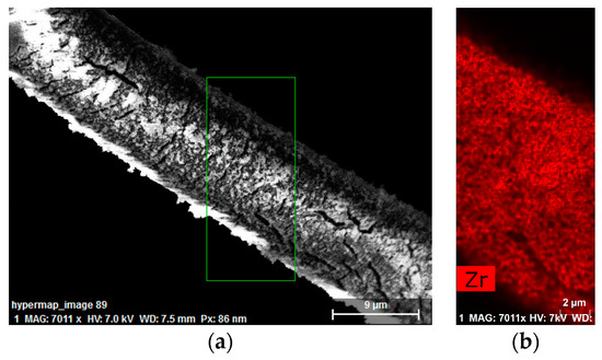 (a) Scanning electron microscopy (SEM) image of a cotton fiber functionalized with UiO-66 with the energy-dispersive X-ray spectroscopy (EDX) mapped region highlighted in green; (b) EDX zirconium map of the highlighted area shown in (a).