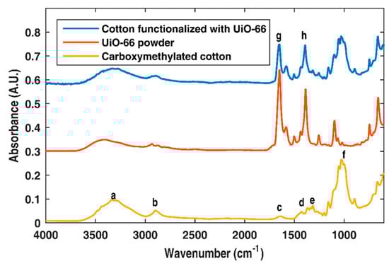 Fourier transform infrared spectroscopy (FTIR) spectra of bare cotton fabric, UiO-66 powder and UiO-66-functionalized cotton fabric.