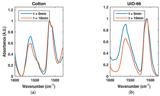 The catalytic activity of the cotton samples functionalized with UiO-66 MOFs was assessed in the degradation of acetaminophen. The degree of degradation was evaluated via FTIR by monitoring the 1560 cm−1 peak, which is ascribed to one of the N–H bending modes in acetaminophen. The signal was normalized to the 1500 cm−1 peak, which is ascribed to one of the phenyl C–C stretching modes. This peak should remain constant during the photocatalytic degradation [41]. Experiments were performed with the scoured cotton samples (control) and the cotton samples functionalized with UiO-66. In both experiments, the photocatalytic degradation of acetaminophen was noted (Figure 8). However, when the cotton sample functionalized with UiO-66 was used, the decrease in the N–H band was larger than in the experiments performed with the as-received samples. These results indicate that the presence of the UiO-66 increased the photocatalytic efficiency of the cotton by 63% after only 10 min of UV exposure.