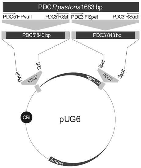 Once the DNA sequence for the PDC enzyme had been obtained, PCR was performed to amplify the complete ORF. For this, the genomic DNA of P. pastoris GS115 was used as a template. The primers used were PDC5’F and PDC3’R (Table 2), and the fragment amplified was approximately 1.6 Kb, matching the expected size. The strategy used for construction of the PDC interruption cassette is summarized in Figure 1. For PDC gene interruption, the sequence was divided into two fragments: PDC5’ and PDC3’ (840 and 843 base pairs, respectively—see Figure 1). First, the pUG6 plasmid was treated with PvuII and SalI and the PDC5’ fragment was amplified using the primers PDC5’F and PDC5’R (Table 2). The PDC5’ fragment was then cloned into the vector at the upstream region from the kanamycin resistance marker. After confirmation by PCR, the plasmid was treated with the restriction nucleases SepI and SacII. The PDC3’ fragment, amplified by PCR using the primers PDC3’F and PDC3’R (Table 2), was then cloned downstream from the kanamycin resistance marker and its insertion was also confirmed by PCR (data not shown). PCR amplifications were performed in a 20 μL reaction mix containing 2.5 pmol of each primer, 2.5 units Taq DNA polymerase, 0.2 μM of each dNTP, 2.0 µL 10× reaction buffer (10 mM Tris-HCl pH 8.3, 50 mM KCl, 1.5 mM MgCl2), and 50 ng of chromosomal DNA. Amplifications were performed with the following conditions: 95 °C for 30’, 95 °C for 15’, 58 °C for 30’, 72 °C for 3 min (30 cycles) and 72 °C for 10 min. This vector was named pUG6-PDCK, and it contained a cassette composed of PDC5’, followed by the kanamycin marker and the PDC3’, a fragment of 3.3 Kb in all.