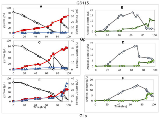 Fermentation profile of the strains GS115 (A,B), Gp (C,D), and GLp (E,F) showing consumption of glycerol (gray circle) and the production of biomass (red square), lactate (blue triangle), arabitol (gray diamond) and acetate (green circle). 4% glycerol was added at 70–80 fermentation hours when oxygen was limited. Experiments were performed in biological triplicates, and the figure shows a typical fermentation profile.
